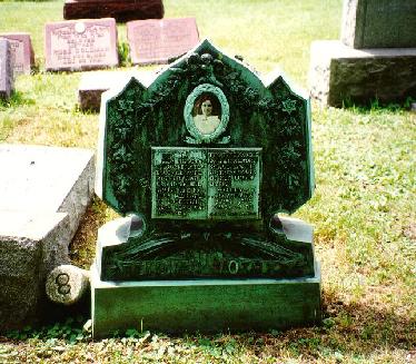 Becky Abramovitz, beloved mother, lies beneath this unusual green bronze monument near the entrance to the rear section. (1915)