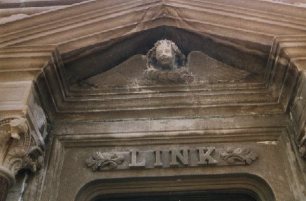 The Link mausoleum is the more ornate of the two mausoleums at St. Boniface, featuring saints on either side of the door and a cherub above.