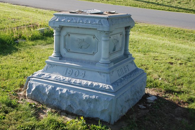 has an ornately carved monument, showing a window opened wide to reveal clouds and the rays of the sun, perhaps symbolizing the gates of heaven.
